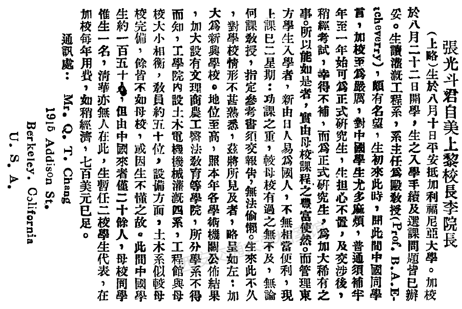 1935年,张光斗正在美国写给黎照寰校长和李院长的信:“通俗须补半年至一年始可为正式研究生。商量后,稍经测验,幸得不补,而为正式研究生,为加大罕见之事。所以能如是者,实由母校课程之丰硕使然。”。