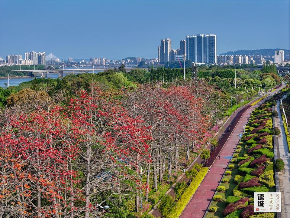 闽江公园更是榕城木棉抚玩的焦点胜地,这里种植了上百株木棉树,笔曲的木棉树高达20余米,而北园的木棉则参差分布正在望龙园、缤纷园、华龙园等处,取园内的绿植、江景相映成趣,行走正在公园步道上,满目火红,随手便能定格江风取花影交错的夸姣。