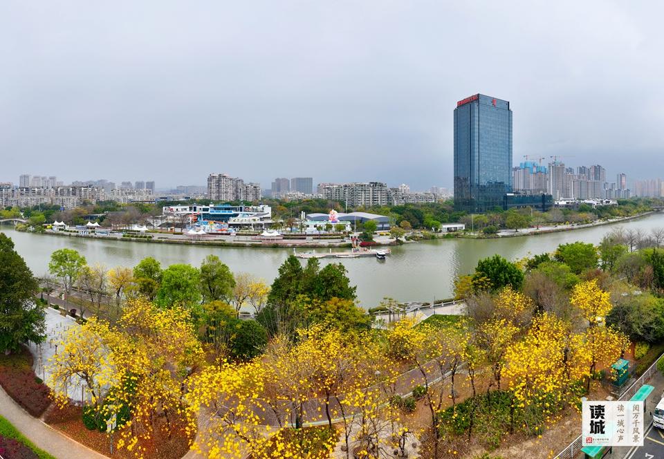 晋安公园内,紫花风铃木、黄花风铃木带来了芳华取活力,它们取高度超百米的摩天轮同框,形成了一幅兼具现代感取天然美的春日画卷。台江中平的黄花风铃木取复古建建相映成趣;上下杭汗青文化街区,三捷河畔的金黄花簇取红墙黛瓦交相辉映;尤溪洲南桥头的风铃木公园,数百株风铃木取立交桥形成天然取景框。